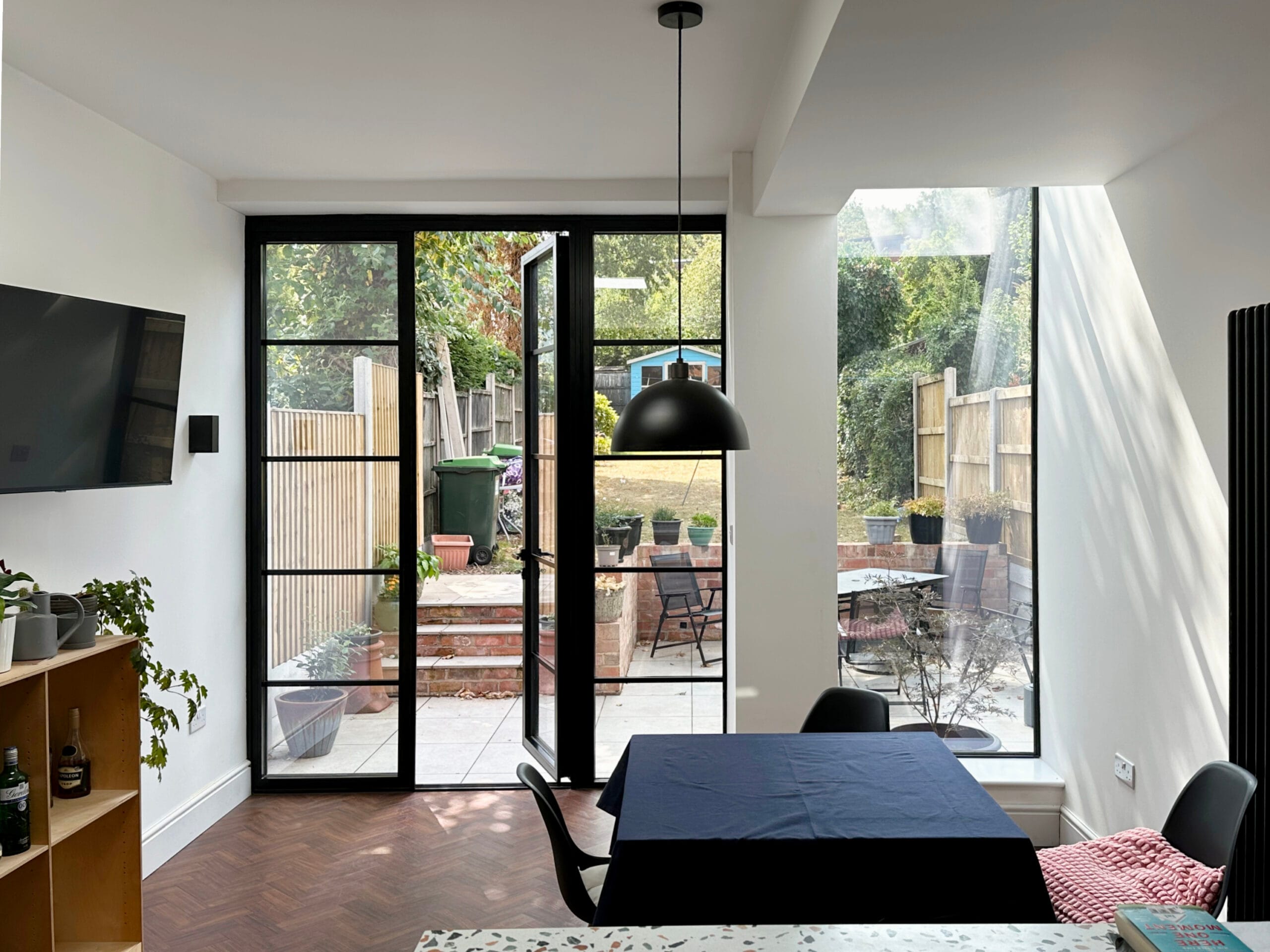 We created a two volume space to work alongside the volumes of the existing house. A taller brick built volume pushes out slightly further to the rear with Crittall style double doors and side-light. For the side return we differentiated the heights of the volumes. The side return was slightly lower and timber clad. A contemporary up and over fixed window and roof-light adds dramatic daylighting to the space. This adds glimpses of the sky, the trees and dramatic shadows as the sun tracks around the sky.